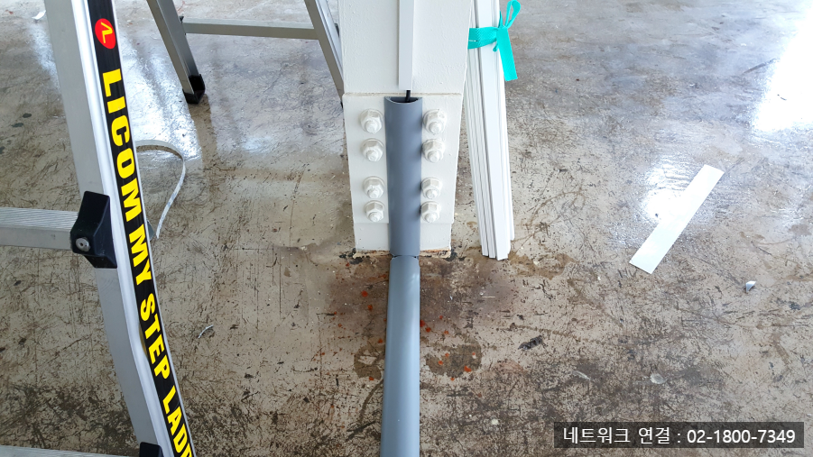 공사는 가장 먼저 자재 준비와 공간 분석으로 시작되었습니다. 첫 번째 사진에서 볼 수 있듯, 접이식 사다리, PVC 배관, UTP 케이블, 공유기 박스, 그리고 선정리용 공구 등이 깔끔하게 정리되어 작업 전 준비가 철저하게 이루어진 모습입니다. 특히 건물 구조와 전원 위치를 고려해 각 장비의 최적 위치를 미리 검토한 것이 포인트였습니다.