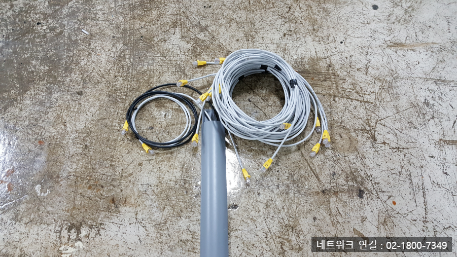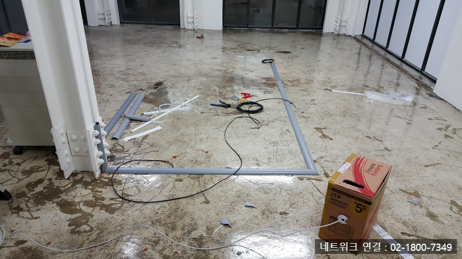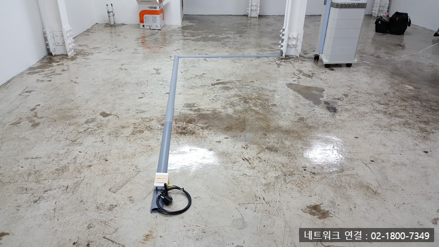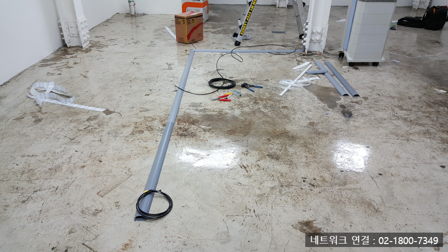 바닥에 놓인 회색 배관은 케이블 포설을 위한 트레이로 활용되었습니다. 배선 위치는 실내 구조와 동선을 고려하여 바닥면을 따라 “ㄱ”자 또는 “ㄷ”자 형태로 설계되었으며, 두 번째와 세 번째 이미지에서 그 형태가 뚜렷하게 드러납니다. 이는 작업자의 이동에 방해가 되지 않도록 하면서도 네트워크 연결을 최대한 깔끔하게 유지하기 위한 선택이었습니다.
