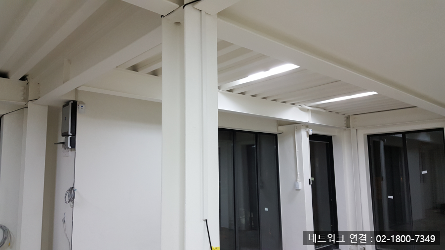 천장과 기둥 구조를 활용한 케이블 배선도 중요한 부분입니다. 이 사진에서는 검정색 케이블이 천장을 따라 직선으로 정리되어 있으며, 이는 외관을 해치지 않으면서도 신호 간섭을 최소화하기 위한 방식입니다. 이와 같은 고정은 벽 클립과 케이블 타이를 이용하여 견고하게 마무리되었습니다.